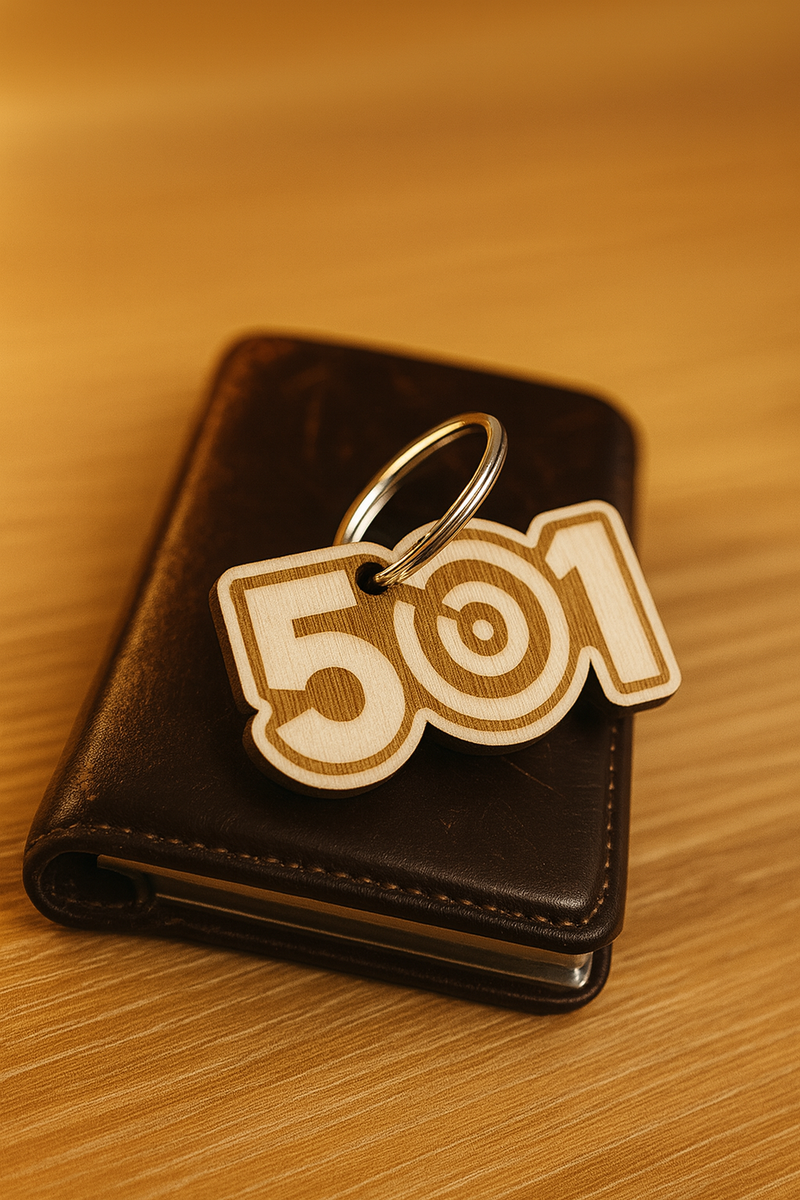 501 keychain made of wood in Finland. Suitable for both keys and for marking your darts case.
